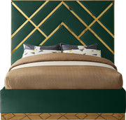 Take your bedroom space to a whole new modern level with this Vector green velvet queen bed. Posh velvet upholstery in a lovely green color is intersected by polished gold metal in a geometric design that is nothing short of spectacular. This stunning bed has a gold metal base to finish off the presentation on a glamorous and upscale note. Full slats are included with the bed to help provide support for your mattress, and the platform footprint ensures you need no box springs or foundation to recreate this look at home.