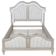 Elevate your restful bedroom retreat with this elegant, glam platform bed. A curvy double arch headboard and footboard are designed with a padded insert of flared channel tufting that lends an eye-catching motif. Each padded piece is upholstered in a soft, ivory fabric that lends a neutral color palette. A silver oak finished frame gives off a chic pearlescent look and feel, accented by glittering panels that rest flush between the crown molding and trim details throughout. Slender, tapered legs offer a subtle lift, allowing for extra storage beneath. Key Features: • Double arch head and footboards feature ivory fabric upholstery with foam padding • Glittering accent panels bring sparkling sophistication to any bedroom • Silver oak finish is elegant and modern, delivering a glam finishing touch • Elegant trim details and channel tufting emphasize graceful curves • Complete with wide rails and tapering legs for a sleek stance