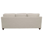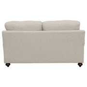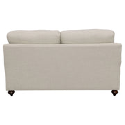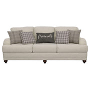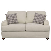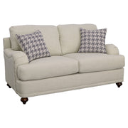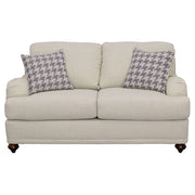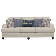 Taking a page from cottage-style farmhouse ambiance, this two-piece sofa and loveseat set wins over family and guests with its elegant simplicity. With tailored English arms and turned legs offering a contrasting espresso finish, each piece of this set shines with a light grey linen-like upholstered cover. Reversible cushions with T-cushions on each end create comfort and stay in shape, as a solid wood frame with a sinuous spring deck sets the stage for durability. Attached back cushions remain stationary to prevent shifting. Enjoy the designer look of seven accent pillows with varying blue print covers. Key Features: • Bring LOVE to your living area with this sophisticated farmhouse collection • Tailored English arms • Turned legs in espresso • No rearranging required with easy to maintain attached back cushions • Extend the life of your upholstery set with reversible seat cushions