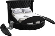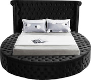 Marvel at the remarkable beauty and graceful lines of this round Luxus black velvet king size bed. The headboard, footboard and side rails are all adorned with deep button tufting, and there is nailhead trim on both sides of the tall headboard. The footboard and side rails all contain ample storage and seating, making it easy to sit down in comfort so you can put on your pants or shoes.