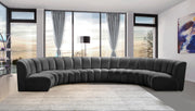 Create a seating group that works for every possible situation with this Infinity modular 7-piece sectional and other pieces in the Infinity collection. Upholstered in soft grey velvet material that feels great against the skin and offers long-wearing beauty, this piece fits with other Infinity items for an infinite number of combinations that get your seating requirements just right but that look just as nice when used on their own.