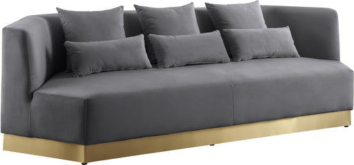 Seat guests in complete luxury on the Mila Grey Velvet Sofa. The bold grey color makes a statement in your space, and the gold stainless steel fram...