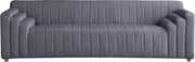 Express your bold, contemporary side with this Naya velvet sofa. This handsome piece is upholstered in grey velvet and blends seamlessly with the other units in the Naya collection, or it looks equally as beautiful on its own. Deep channel tufts run the length of the back, arms and seats of this unit, ensuring its exceptional comfort while giving it a decidedly modern vibe.