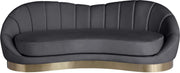 Unwind and rest whenyou'rere seated on this Shelly velvet sofa featuring soft grey velvet upholstery. This lovely piece is just the thing to inject drama into your space whether used on its own or in combination with other items in the Shelly collection. The unique shell shape immediately commands attention, and the brushed gold stainless steel base cements the base in contemporary panache.