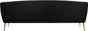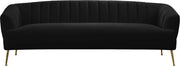 Dress up your living room space with this Tori Velvet Sofa. This plush sofa features sleek black velvet upholstery that covers every square inch, adding a sumptuous and svelte look to your room. The gold legs with a ball design on the foot adds to the elegant look of this pretty chair, and deep channel tufting adds loft to the back and arms for a lavish feel when you sit down to relax and unwind at day���s end.