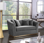 Make the Arabella Grey Velvet loveseat your favorite naptime spot. This handsome loveseat is upholstered in grey velvet for a glamorous touch and is accented with gold stainless steel around its base for a touch of modernity. Its curvy back gives it a graceful look in your living room or den, and it comes with coordinating throw pillows that beckon you to sit down and rest (or nap) for a spell.