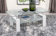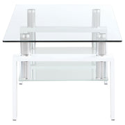 Enhance your living room with this sleek rectangular cocktail table, designed for style and functionality. It features a clear tempered glass top, complemented by a frosted tempered glass lower shelf for added storage or display. Supported by a sturdy metal frame, this coffee table combines durability with a modern aesthetic. Perfect for creating an open and airy look in your space, this table seamlessly blends contemporary design with practical utility. Key Features: • Rectangular cocktail table with a sleek clear tempered glass top design • Frosted tempered glass shelf adds storage space and visual interest • Durable metal frame with a white powder coated finish for a clean look • Stylish modern design perfect for enhancing contemporary living spaces • Clear and frosted glass accents create a bright, open, and airy feel • Versatile table suitable for daily use or entertaining in any living room